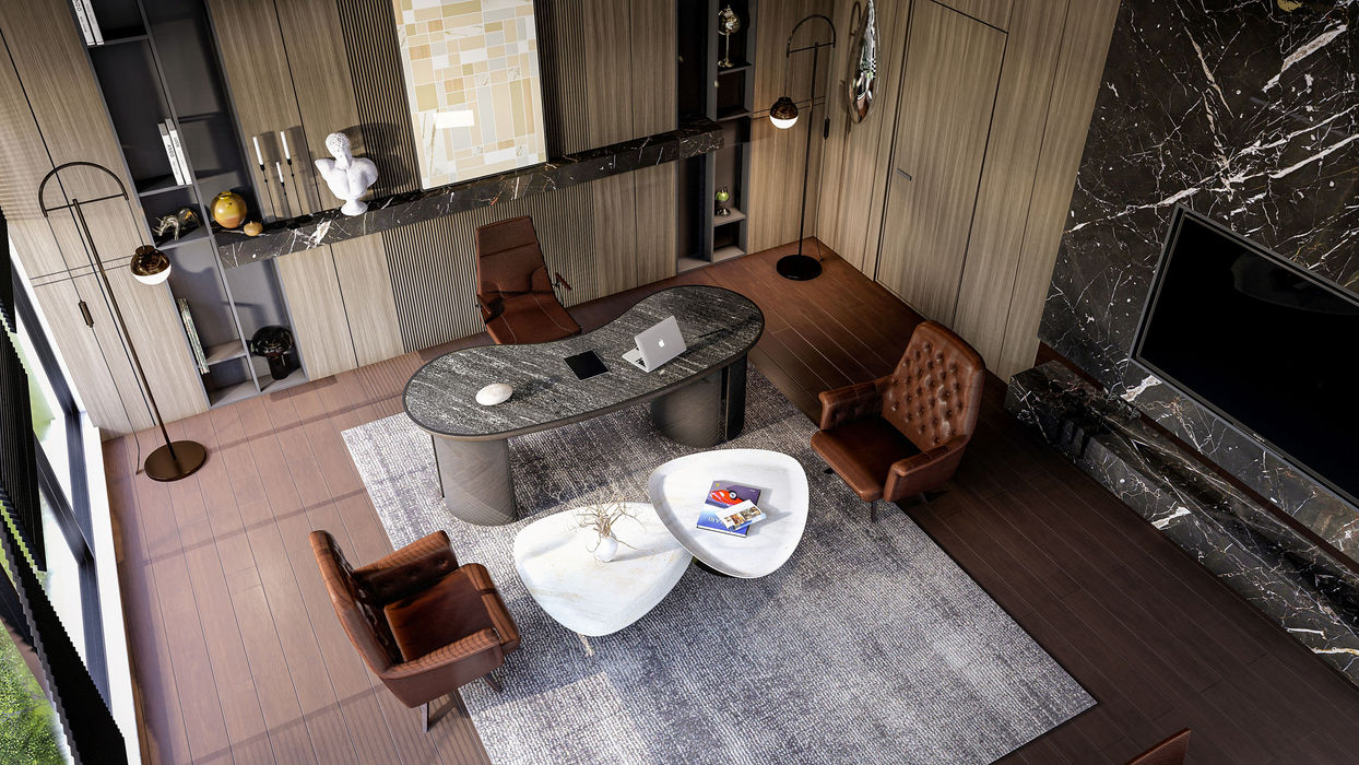 The interior design project, co-designed with architect İbrahim Halil Yel, was created for Mr. Siraç Can, whose company office is located in Antalya. Before beginning the design, we identified the client's needs and took measurements of the existing space. The client expressed a preference for shades of brown and specified a need for storage, a meeting area, and a workspace, requesting that the design reflect these requirements.