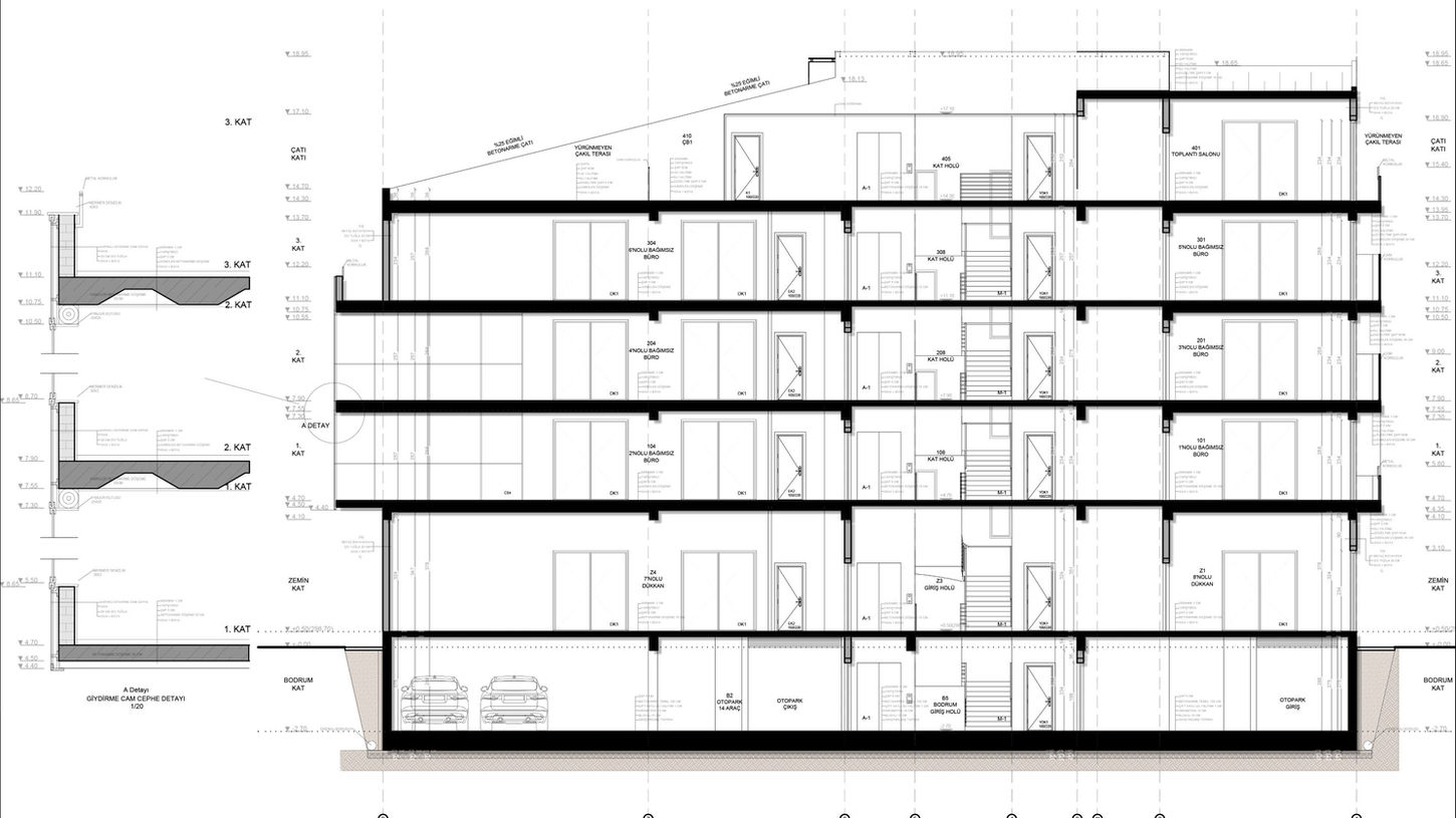 The office building designed by O&B Architecture is located in Bahçeyaka Neighborhood, Döşemealtı district of Antalya, on parcel 6 of block 456. The structure consists of 1 basement floor, 1 ground floor, 3 typical floors, and 1 roof floor, aiming to meet the demand for workspaces due to the increasing population density in the district.